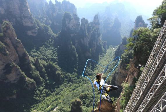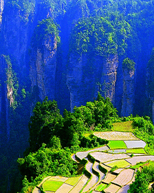 張家界,是湖南一個(gè)著名的風(fēng)景區(qū),一座天然的森林公園。黃石寨、天子山、金鞭溪等勝境,是令游人心馳神往之地。在我們出發(fā)之初,心就早已高高飛揚(yáng),五個(gè)多小時(shí)的顛簸終于把我們載到了目的地,導(dǎo)游是一個(gè)年輕的女孩子,一見面就放開歌喉唱了首當(dāng)?shù)赝良易宓母柚{,歌聲婉轉(zhuǎn)動聽,一下子讓我們領(lǐng)略到了鄉(xiāng)村